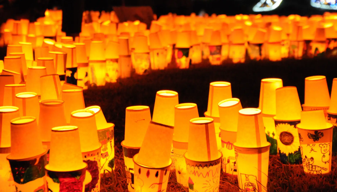 参加者が紙コップに絵を描いて作った手作りランタンを河川敷一面に並べ、日が落ちると縦横15mにもなる巨大な文字が浮かび上がります。「絆」「幸」「命」など、その年ごとに異なる言葉が灯りで描かれる光景はまさに圧巻で、思わず写真を撮らずにはいられません。